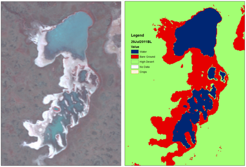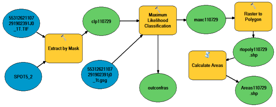Figure 4:  Use of Model Builder to create a process where SPOT image files and water spectral signatures inputs output water polygons and contemporaneous water surface area quantities in the high desert.  Land classifications were trained via a supervised maximum likelihood classification scheme.