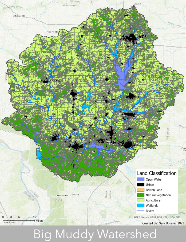 Figure 2:  The Hydrology tools in ArcGIS Pro were used to generate the Big Muddy Watershed drainage area shown here, along with land classification delineation starting with data from the National Land Cover Database.  Two DEMs overlapping the area of interest were obtained from the USGS National Map Download application, and the drainage area and main river networks were derived from this.  The results were compared to the National Hydrography Database (NHD) WBD and flowlines and are in agreement.  Land classifications originated from the National Land Cover Data (obtained from the Multi-Resolution Land Characteristics Consortium), and were refined down to the classifications shown.
