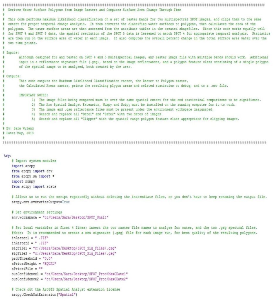 Figure 5:  Unique Python script (pages 1 & 2 of 7) for water availability and temporal change analysis extracted from SPOT images in Oregon’s remote high desert.