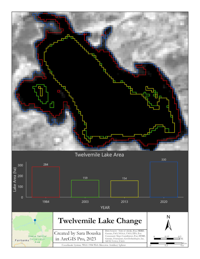 Figure 1:  ArcGIS Pro map of the Twelvemile Lake surface area change over the years.   Water pixels were mapped from Landsat 8 image bands utilizing the Normalized Difference Water Index (NDWI).  The shorelines were then extracted and compared.